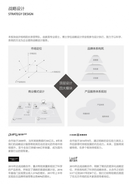 由許柏鳴院長親領帶隊,由家具專業(yè)碩士、博士學位戰(zhàn)略設 計師全程參與設計執(zhí)行,致力于以科學、系統(tǒng)的方法為企業(yè)提供戰(zhàn)略設計服務;