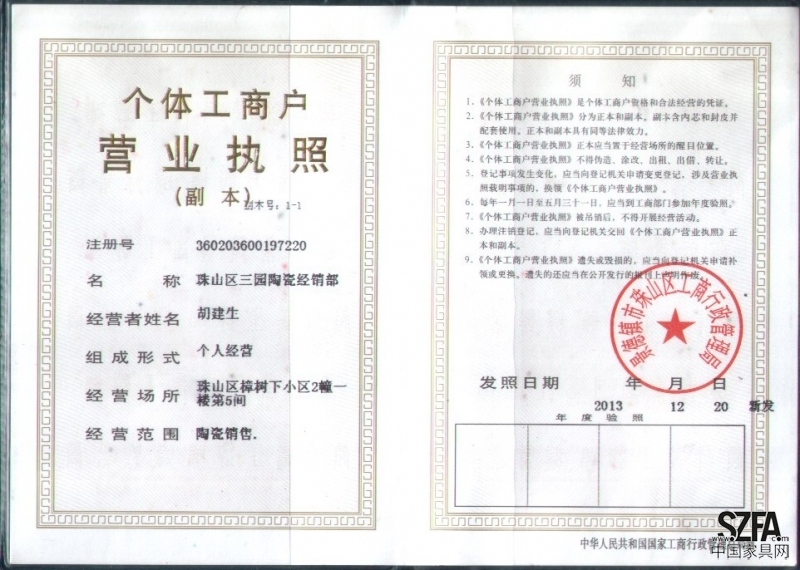 | 發(fā)證機(jī)構(gòu): | 江西省景德鎮(zhèn)市珠山區(qū)工商行政管理局 | 發(fā)證時(shí)間 : | 2012-12-20 |