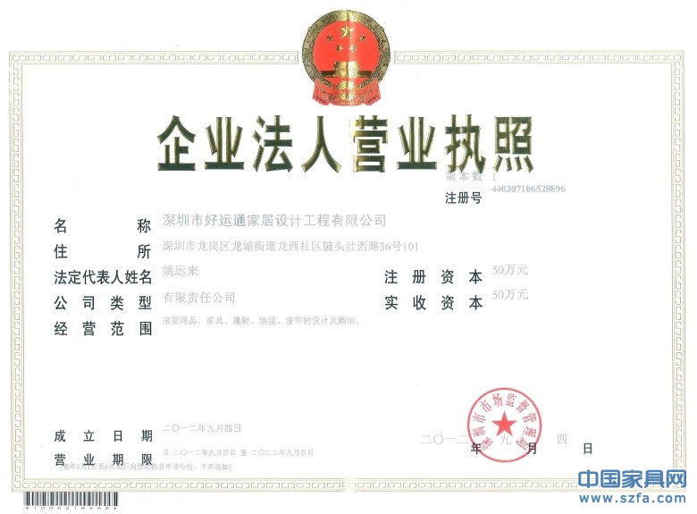 深圳好運(yùn)通家具設(shè)計工程公司營業(yè)執(zhí)照0755-86326917