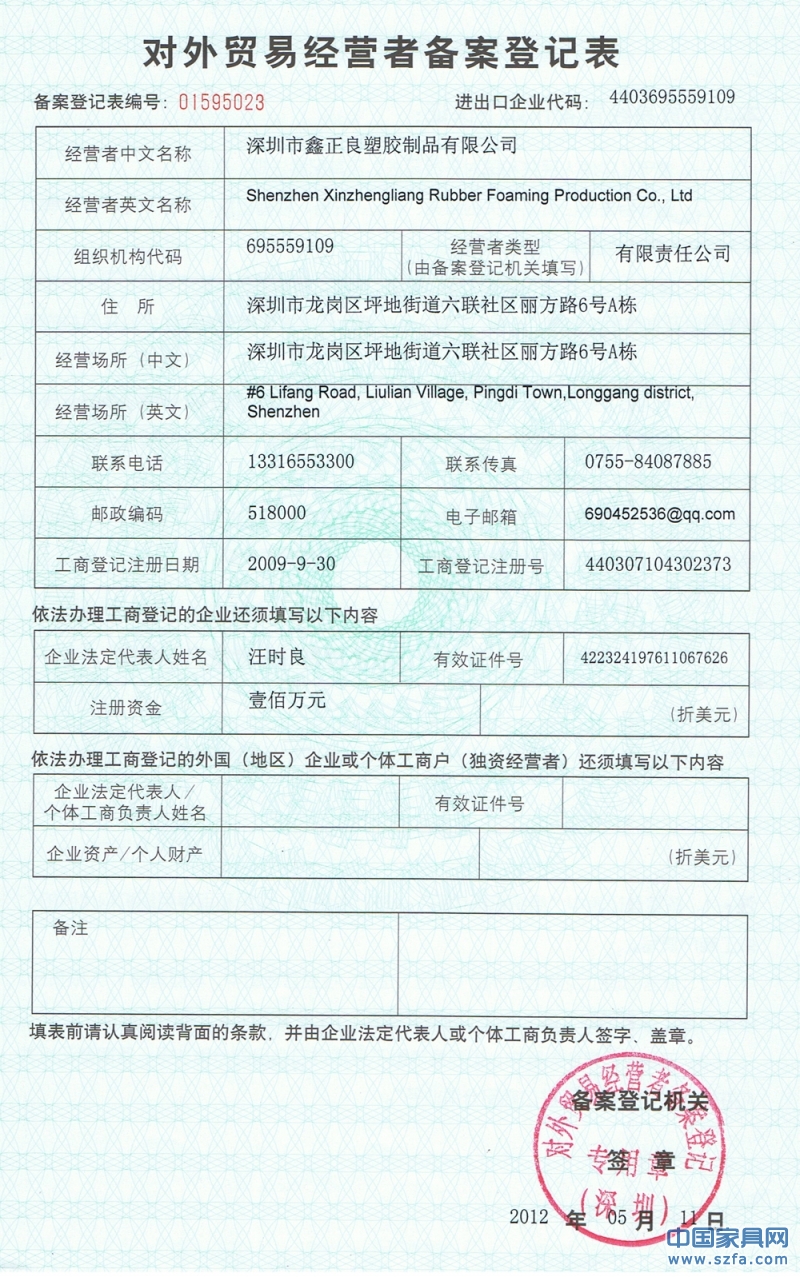 | 發(fā)證機(jī)構(gòu): | 深圳對(duì)外貿(mào)易經(jīng)營(yíng)者備案登記局 | 發(fā)證時(shí)間 : | 2012-05-11 |