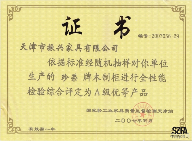 | 發(fā)證機(jī)構(gòu): | 國(guó)家輕工業(yè)家具質(zhì)量監(jiān)督檢測(cè)天津站 | 發(fā)證時(shí)間 : | 2007-05-01 |