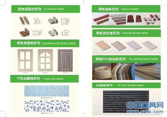 家具配套材料:主要產(chǎn)品有:同色包覆線條、同色包覆鋁型材、同色PVC膜、同色吸塑門(mén)板、同色百葉門(mén)、同色封邊條、坑槽板及各種款型腰線等。同色線條系列:2745×72和2745×54羅馬柱、2440×36和2440×27柱頭線、72×72~54×54羅馬柱頭、2745×75歐式頂線、2745×72歐式底線、2745×72修邊線。同色鋁型材系列:三款4.8米豎框和6米的有:上軌、下軌、上方、下方及兩款中方。另:2400×300的有11款不同圖案的腰線、8款不同型號(hào)的同色吸塑門(mén)板、兩款4×8的坑槽板、4款不同型號(hào)長(zhǎng)度為2750mm的同色百葉和各種規(guī)格的封邊條。