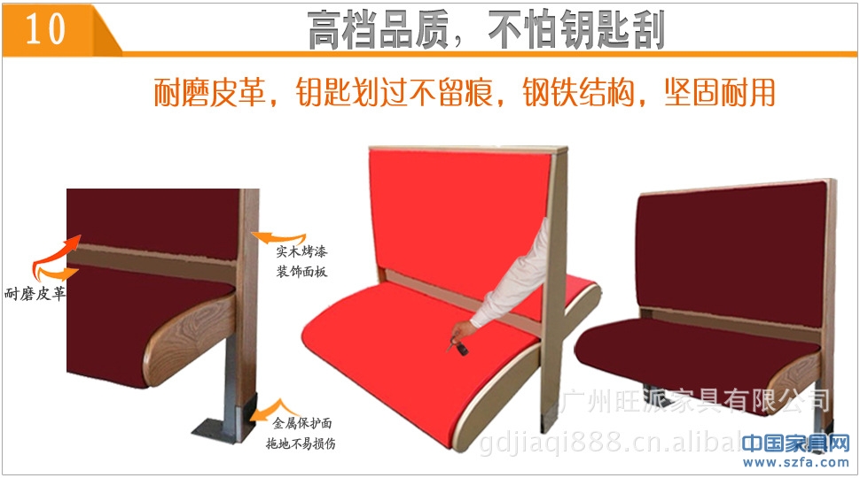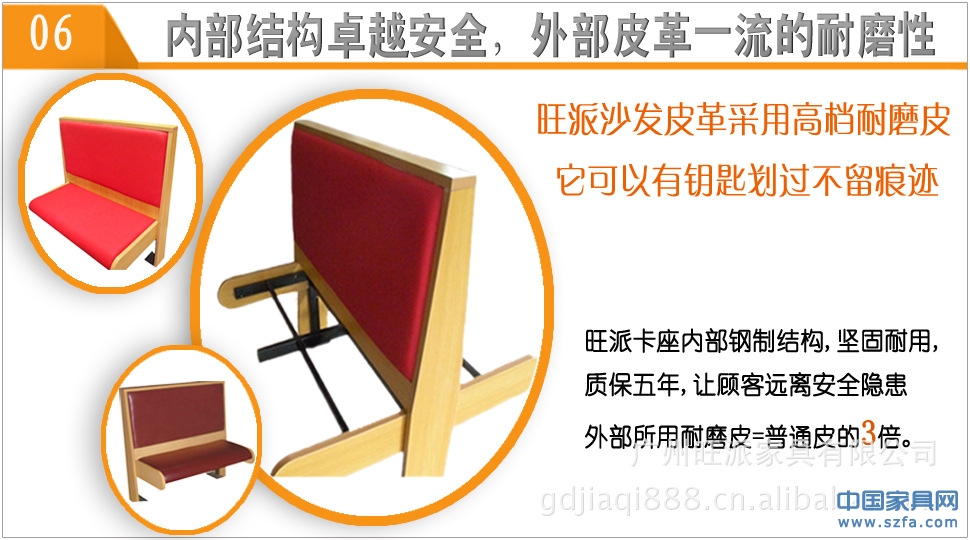 1、最新推出高檔耐磨皮:旺派沙發(fā)生產的卡座沙發(fā)采用鋼制結構或木制結構特定的高檔耐磨皮,普通面料的皮革卡座沙發(fā)皮革一般使用一年左右就會出現不同程度裂口,掉皮等自然老化現象,旺派沙發(fā)廠生產的卡座沙發(fā)全部采用特定的高檔耐磨皮,經驗證:用鎖匙刮過后都不會出現裂口,刮痕,如果您有需要我們可以免費為您寄過皮樣色卡,您收到皮樣后您可以同普通皮革作對比(郵寄費由買方支付)