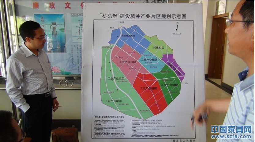 上圖為:逸馬家居顧問集團董事長郭勇軍兼浙江年年紅集團產(chǎn)業(yè)發(fā)展投資顧問聽取騰沖經(jīng)濟開發(fā)區(qū)楊副主任對“橋頭堡”產(chǎn)業(yè)片區(qū)規(guī)劃示意圖的講解