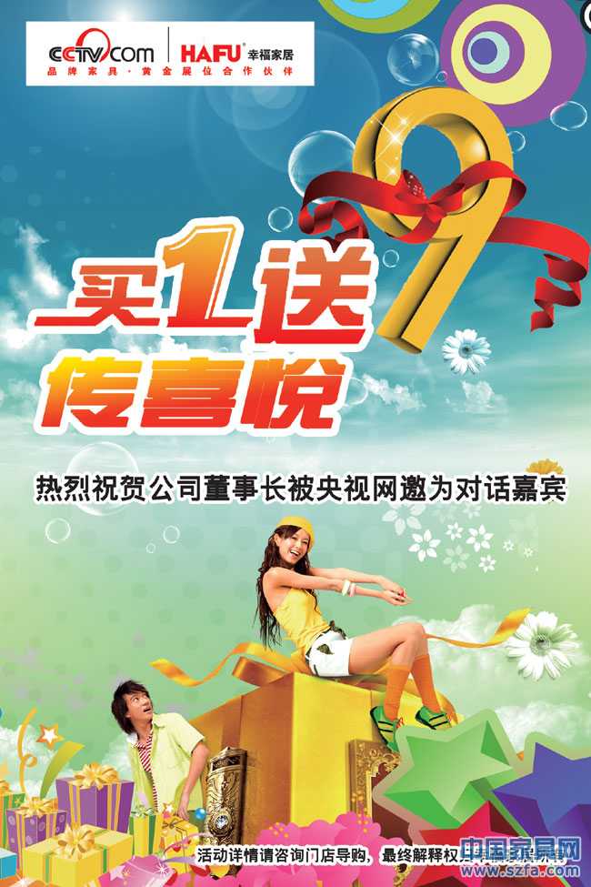 為熱烈慶祝廣州家具品牌幸福家居董事長(zhǎng)受央視網(wǎng)榮譽(yù)邀請(qǐng)為對(duì)話嘉賓,現(xiàn)廣廣州家具品牌幸福家居推出“買一送九”,超優(yōu)惠活動(dòng),客戶凡在幸福家居消費(fèi)滿4999元,即可享受幸福家居送出的九件實(shí)用家居禮品!機(jī)會(huì)不等人,等人的不是好機(jī)會(huì),大家快快行動(dòng)起來(lái)吧!