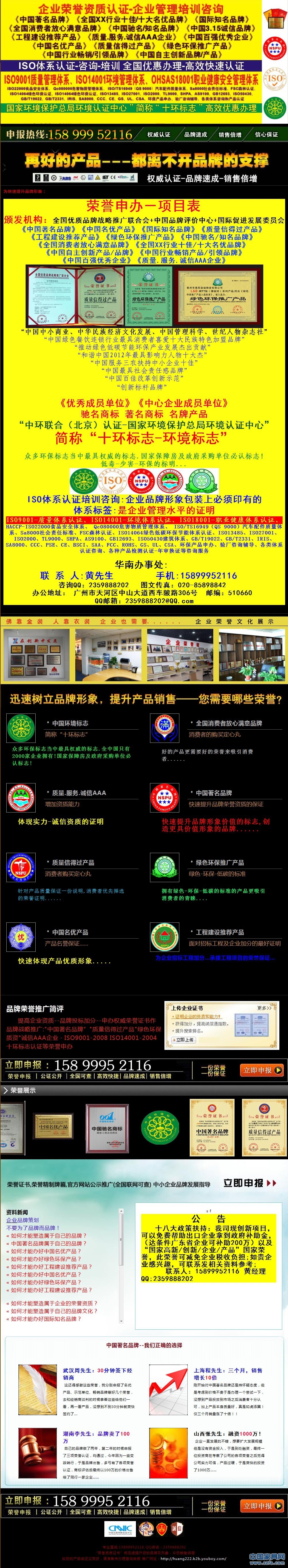國(guó)家權(quán)威機(jī)構(gòu)認(rèn)證申辦:《中國(guó)著名品牌》《中國(guó)名優(yōu)產(chǎn)品》《質(zhì)量信得過(guò)產(chǎn)品》《全國(guó)XX行業(yè)十佳名優(yōu)品牌》《質(zhì)量.服務(wù).誠(chéng)信AAA單位》《全國(guó)消費(fèi)者放心滿意品牌》《綠色環(huán)保推廣產(chǎn)品》《中國(guó)工程建設(shè)推薦產(chǎn)品》《國(guó)際知名品牌-中英版》《廣東省名牌產(chǎn)品》《廣東省著名商標(biāo)》《中國(guó)環(huán)境(十環(huán))標(biāo)志》各項(xiàng)ISO環(huán)境體系認(rèn)證CCC認(rèn)證等多項(xiàng)品牌產(chǎn)品榮譽(yù)證書申辦,海內(nèi)外商標(biāo)專利注冊(cè)及公司工商注冊(cè),擁有龐大的服務(wù)網(wǎng)點(diǎn),高覆蓋、高效率的服務(wù)獲得多家公司和機(jī)構(gòu)的認(rèn)可。將以最專業(yè)的精神為您提供安全、經(jīng)濟(jì)、專業(yè)的服務(wù)。聯(lián)系人:15899952116黃經(jīng)辦