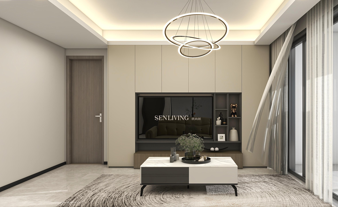 低飽和度色的空間,極簡而克制,彰顯留白的藝術(shù)美感;凹陷式電視背景墻,集儲(chǔ)物于一體;吊頂嵌入線燈,營造舒展的空間氛圍,造型新穎的吊燈成為點(diǎn)綴,更添意趣。