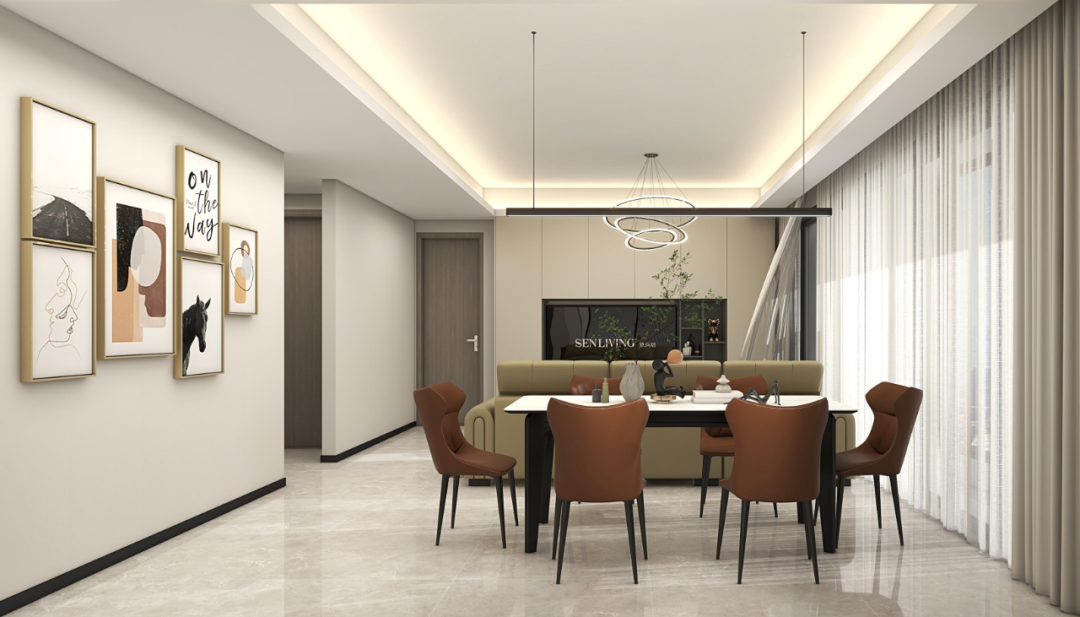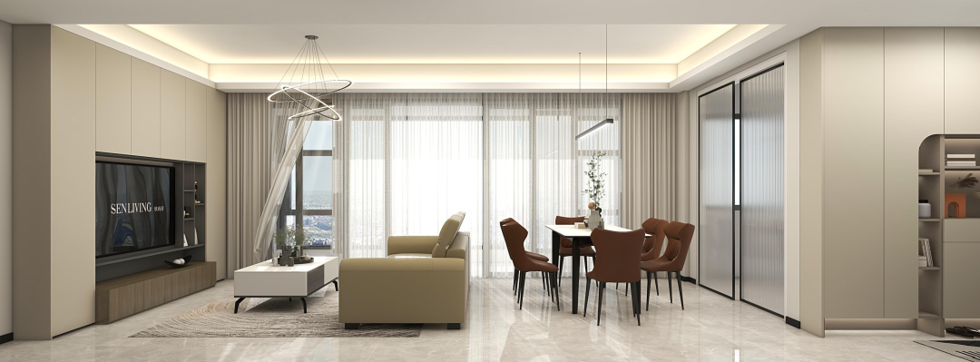客廳餐廳“零隔斷”有效實(shí)現(xiàn)視覺延伸,打造出空間感。用餐區(qū)與廚房相鄰,布局松弛有度,間以長虹玻璃推拉門隔斷,兼顧采光與裝飾性,構(gòu)成一個(gè)閑適自由的用餐空間。