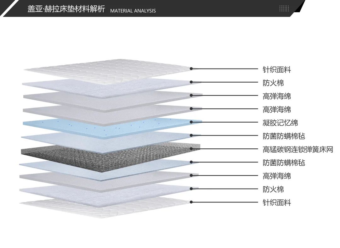高彈海綿+凝膠記憶棉+防火棉+防菌防螨棉氈等材質(zhì)疊加填充,層層加護(hù),柔軟從“芯”出發(fā);高錳碳鋼連鎖彈簧床網(wǎng),靜音抗擾,暢享一夜深睡。