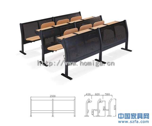 1)椅座:基材采用優(yōu)質多層熱壓成型板,面壓櫸木色防火板,板面為光面,厚度達15mm, 切面PVC封邊。座椅可回彈復位。