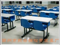 采用最經(jīng)濟的塑料材質(zhì)制作而成,普遍采用四人一桌的形式,桌子和椅子是連在一起的,白色的桌面加上藍色的靠背椅子
