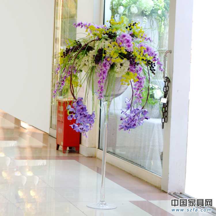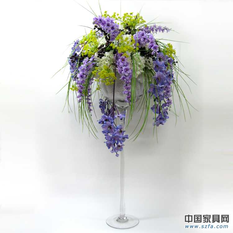 【套餐組成】由白色繡球,紫色彩雀,紫色萬(wàn)代蘭,黃色蕾絲,塑膠草組合而成。適合賓館,客廳,工程用花。