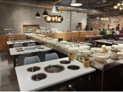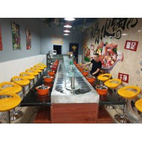 回轉(zhuǎn)自助小火鍋設(shè)備輸送帶電動餐桌特點優(yōu)勢如下: