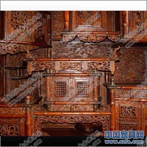 紅木大鳳閣:采用防竹節(jié)紋和鳳紋的雕飾手法,給人耳目一新。