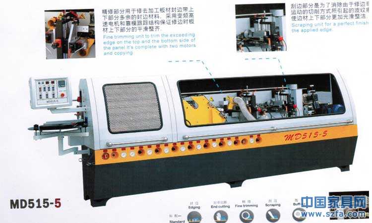 本機床能從板材送入后自動完成:粘接封邊、前后齊頭、上下平修(此項功能僅限MD515-6)、上下精修、上下刮邊(此項功能僅限MD515-5及MD515-6)、上下拋光六種功能,避免了手動加工過程中出現(xiàn)的加工誤差,保證了加工尺寸的一致性。本機床自動化程度高、封邊質量好、生產(chǎn)效率高,并且造型美觀、結構緊湊、工作穩(wěn)定可靠,是板式家具生產(chǎn)廠家使用的重要設備之一。