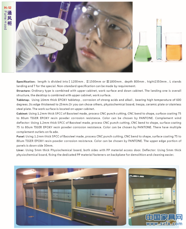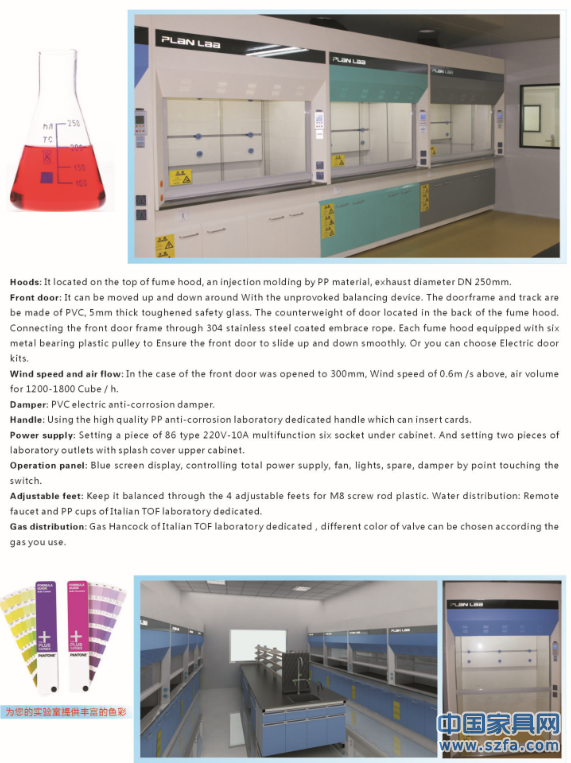lighting, fan and backup power. Airflow plate: 6mm gray acid and alkali resistance material special for laboratory, fixed on the back of the fume