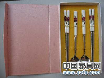 叉勺選用食品級(jí)不銹鋼精制而成,手柄陶瓷為白玉強(qiáng)化瓷,盒內(nèi)墊海綿絲巾布材料,餐具用金絲松緊帶固定,盒子為1000克灰板紙手工制作,盒子表面裱有特種紙,可印刷、可燙印指定的LOGO,陶瓷柄圖案有多種供客戶挑選,更可以定制。