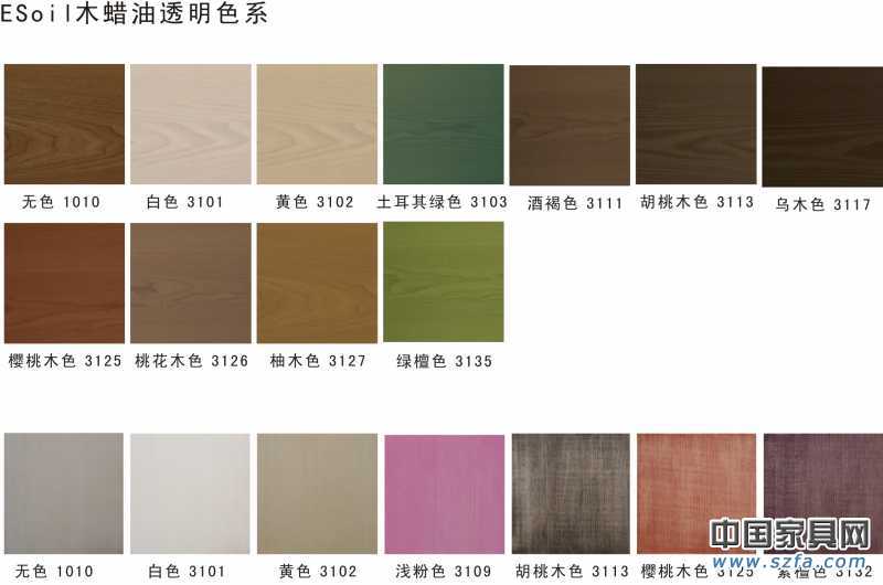 ESoil木蠟油透明色包括無色和有色半透明、透明色,木材表面最終的涂飾效果受不同材質的基材本身的顏色影響。