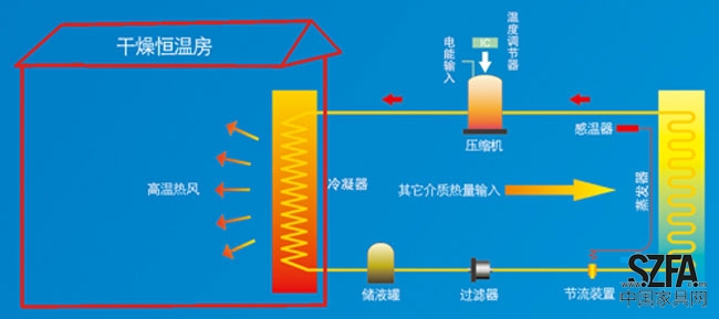 高溫?zé)岜煤娓蓹C組,主要有翅片式蒸發(fā)器(外機)、壓縮機、翅片冷凝器(內(nèi)機)和膨脹閥四部分組成,通過讓工質(zhì)不斷完成蒸發(fā)(吸取室外環(huán)境中的熱量)→壓縮→冷凝(在室內(nèi)烘干房中放出熱量)→節(jié)流→再蒸發(fā)的熱力循環(huán)過程,從而將外部低溫環(huán)境里的熱量轉(zhuǎn)移到烘干房中,冷媒在壓縮機的作用下在系統(tǒng)內(nèi)循環(huán)流動。它在壓縮機內(nèi)完成氣態(tài)的升壓升溫過程(溫度高達100℃),它進入內(nèi)機釋放出高溫?zé)崃考訜岷娓煞績?nèi)空氣,同時自己被冷卻并轉(zhuǎn)化為流液態(tài),當(dāng)它運行到外機后,液態(tài)迅速吸熱蒸發(fā)再次轉(zhuǎn)化為氣態(tài),同時溫度可下降至-20℃~-30℃,這時吸熱器周邊的空氣就會源源不斷地將熱量傳遞給冷媒。