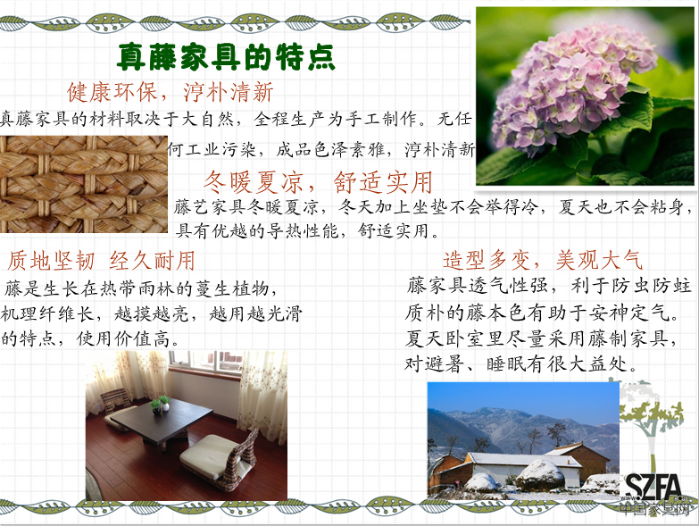 材質(zhì)特點:無論是在家庭中,還是在賓館、庭院、酒吧,藤家具的存在,總能以其天然的材質(zhì),流暢的線條,編織的韻律,提高周圍環(huán)境的品位。原汁原味的藤材,可以營造出一派悠然自得的氛圍,簡約與高雅并存,古典與現(xiàn)代并重,它帶給人的不單是生活品質(zhì)的享受,更是讓人感受到一種樸實無華的家居風(fēng)格、底蘊深厚的家居風(fēng)雅。