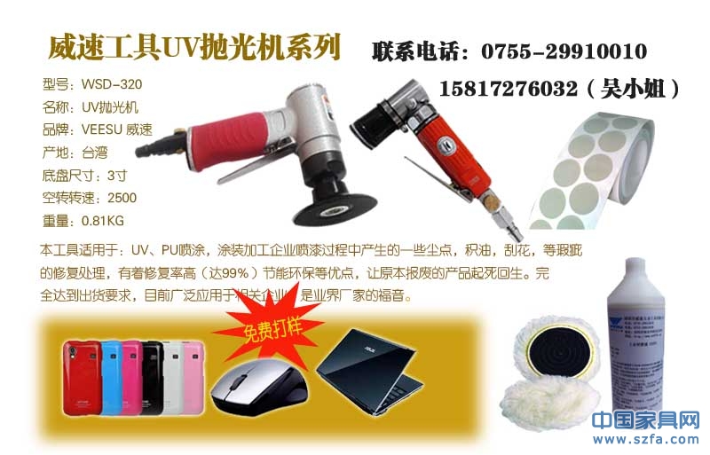 WS-320專業(yè)用于拋光、修復(fù)汽車及日常生活中各種玻璃,UV,PU塑膠的劃痕,需要結(jié)合拋光液、拋光輪、砂紙使用。廣泛應(yīng)用到玻璃深加工領(lǐng)域的最終拋光。如平板玻璃,光學(xué)玻璃,導(dǎo)電玻璃,超薄玻璃,熒光屏(玻殼)等各種玻璃鏡頭,鏡片和水晶制品的拋光在UV噴涂過程中,由于各種因素,會造成部分產(chǎn)品表面有塵點,積油,劃痕,刮花等問題,我們許多廠家對此一籌莫展。只能采用重噴方式進行處理,大部分廠家更是直接將產(chǎn)品報廢。這樣造成很大的人力物力浪費,自從UV打磨機,拋光機問世以來,以上問題便得到完美解決。UV拋光機結(jié)合UV打磨機,拋光蠟,砂紙,羊毛球,等耗材使用。他能完全解決UV、PU等漆面的塵點、劃痕,刮花,積油等瑕疵,修復(fù)率高達到99.9%完全能滿足出貨需求。讓原本報廢的產(chǎn)品能夠變廢為寶。從最根本上降低了成本。