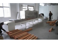 木材微波干燥與眾不同的特點是熱量不是物體外表傳入,而是微波透過物料內(nèi)部被所含的水份和木材本身吸收直接加熱。由于物料的表面水份的蒸發(fā),因此,物料內(nèi)部溫度高于表面。使物料內(nèi)部形成向外的壓力差,加速了水份的表面遷移,所以微波干燥木材的速度遠大于對流干燥速度快20–30倍。比遠紅外和蒸氣干燥能耗降低25%以上。?微波干燥物料可使木材內(nèi)部的溫度高于60℃,使用物料中寄生的蟲卵很快殺滅、達到防蟲蛀、防霉的作用。對于各種不同性質(zhì)的木材要先取合適的隧道式工業(yè)微波加熱速度,達到最佳的工藝條件,方可獲得最佳的效益。?
