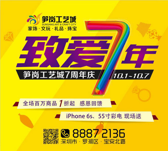 10月,寶能筍崗工藝城迎來開業(yè)7周年店慶。國(guó)慶7天假期,7重豪禮巨獻(xiàn),筍崗工藝城特別推出“致愛7年”七周年慶系列活動(dòng),天天精彩,天天有禮!iPhone6s、55寸高清彩電、品牌變頻空調(diào)、高級(jí)自行車等豐厚大禮現(xiàn)場(chǎng)大派送,嗨到停不下來!