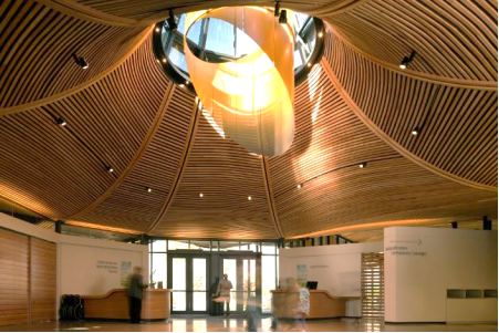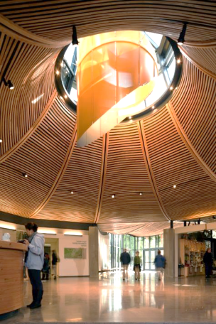 在華盛頓特區(qū)完成的公共圖書館項(xiàng)目就是一個(gè)實(shí)現(xiàn)了藝術(shù)、實(shí)用和成本三足鼎立的優(yōu)秀作品。該項(xiàng)目位于市中心,毗鄰一個(gè)城市公園,為了讓圖書館與公園之間建立強(qiáng)烈的聯(lián)系,圖書館的頂部被設(shè)計(jì)為一個(gè)巨大的木制天篷,猶如城市公園中樹冠的延伸。