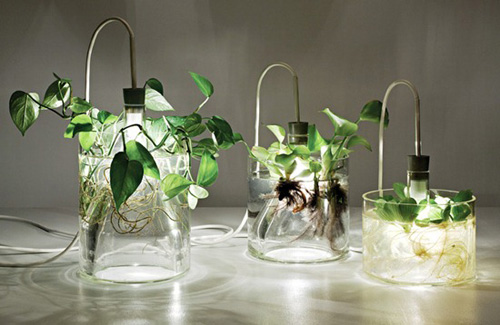 這三只玻璃器皿既是花瓶,又是燈,灌水之后種植一些可以在水中生長的綠色植物,通電打開燈光,植物的根系和枝葉就是對燈光的最純樸自然的裝飾。當(dāng)然,燈是在另一個密閉空間里,并沒有泡在水中,不必擔(dān)心漏電問題…