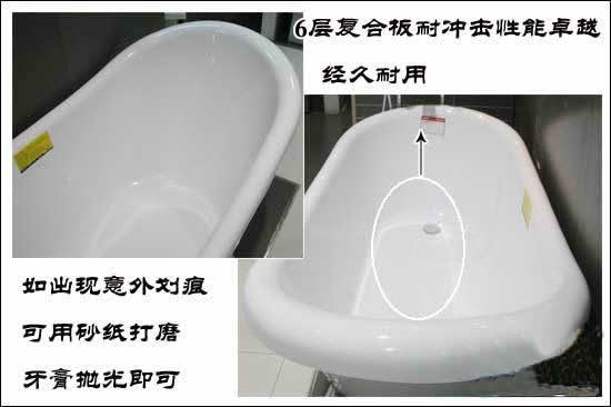 據(jù)了解,浴缸的耐沖擊性能卓越,可以接受由2米空中350g鋼珠落球的沖擊試驗,毫無破裂,遠遠超過了國家試驗標準,這種超強的抗沖擊能力,相信一定能夠勝任日常洗浴要求,經(jīng)久耐用。假如使用過程中不慎出現(xiàn)意外劃痕,可以用1000#砂紙將劃痕磨去,再用牙膏打磨拋光就能像以前一樣了。