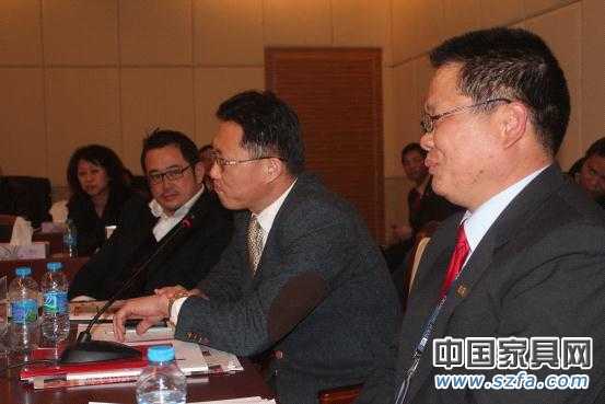 深圳家協(xié)秘書長(zhǎng)侯克鵬(中)及深圳長(zhǎng)江家具有限公司董事長(zhǎng)江學(xué)院(右一)出席研討會(huì)并講話