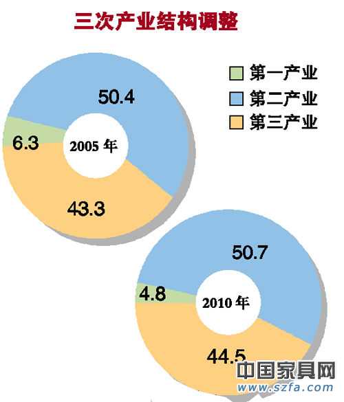 調(diào)查顯示,2010年廣東三次產(chǎn)業(yè)結(jié)構(gòu)為5.0:50.4:44.6,第三產(chǎn)業(yè)比重比2008年提高0.3個(gè)百分點(diǎn)。