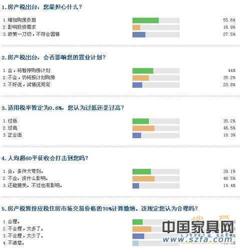對于房產(chǎn)稅的出臺,消費(fèi)者也有自己的看法。在搜房網(wǎng)的專項(xiàng)網(wǎng)絡(luò)調(diào)查中顯示,55.9%的網(wǎng)友擔(dān)心房產(chǎn)稅會進(jìn)一步增加購房負(fù)擔(dān);有44.8%的網(wǎng)友表示會影響到置業(yè),暫停購房計(jì)劃。有近一半的網(wǎng)友認(rèn)為0.6%的稅率偏高,45.5%的網(wǎng)友認(rèn)為人均60平米的征收面積不會影響到購房的意愿。