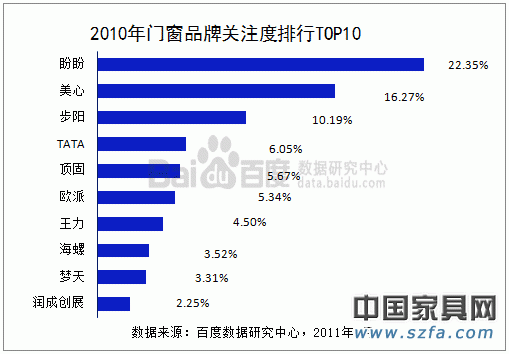 盼盼位于2010年門窗品牌關(guān)注度首位,關(guān)注占比為22.35%。據(jù)第三方數(shù)據(jù)顯示,盼盼門在2010年產(chǎn)銷防盜門160萬樘,同比達到25%。