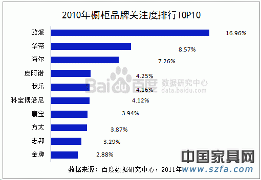 百度數(shù)據(jù)顯示,2010年歐派櫥柜位居櫥柜品牌關(guān)注榜首位,以關(guān)注占比16.96%,遠高于其他品牌。華帝、海爾、皮阿諾、我樂和科寶博洛尼的關(guān)注占比均高于4%,名列第二到第六位。