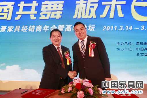 董事長尤國忠先生與中國家具銷售商聯(lián)合會楊亞中會長簽署戰(zhàn)略合作協(xié)議