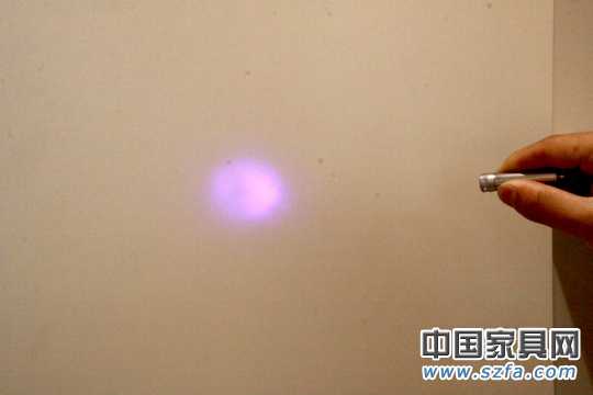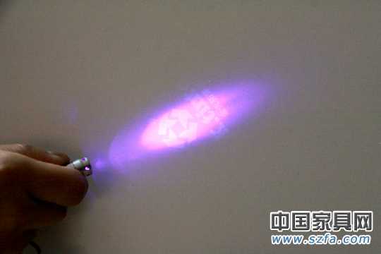 記者看到,只要消費(fèi)者現(xiàn)場用紫外光(波長200~400μm)照射,板材上“金天拓”的品牌標(biāo)志將頓時閃耀呈現(xiàn)。(建議采用常見的驗鈔筆照射)