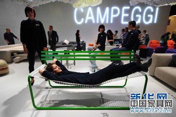 4月12日,一名男子在意大利第50屆米蘭國際家具展上體驗一種新式“沙發(fā)”