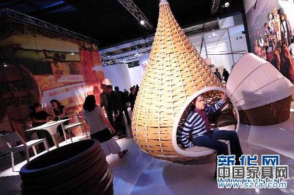 4月12日,一名男子在意大利第50屆米蘭國際家具展上體驗一種懸掛椅