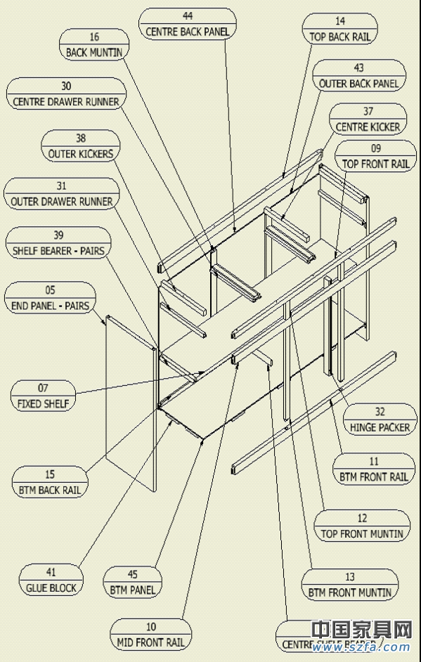 右邊是柜子的前框,有一道工藝縫,整個側(cè)板為中纖板MDF貼單板,不發(fā)生單板撕裂的問題。我將其結(jié)構(gòu)設(shè)計加以改良,如下圖: