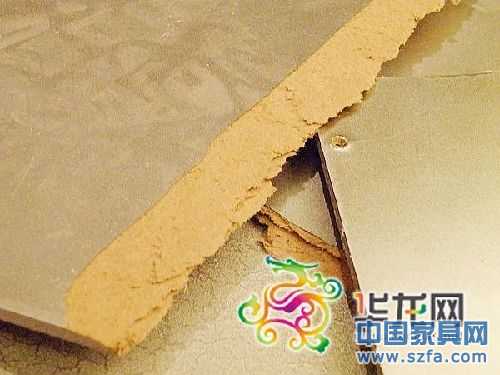 9月9日家具送到,工人安裝電視柜鉆孔時,韋先生意外發(fā)現(xiàn)電視柜背板的螺絲孔有縫隙,露出的材質(zhì)看似紙屑。他隨即割開電視柜的多處面板,發(fā)現(xiàn)絕大多數(shù)都是這種看似紙板的材料(如圖)。