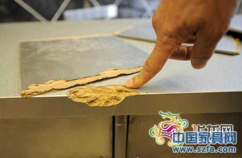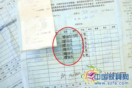 “我要的是實木的,訂單合同上也寫的是櫻桃木,實際上卻是中纖板,這不是玩弄消費者嘛???”韋先生說著,用小刀割開家具表面給記者看,電視柜的面板、底板及隔板內(nèi)部,確實不是實木,而是像紙殼一樣的物質(zhì),而韋先生拿出的合同上主材一欄明確寫著“櫻桃木”,輔材一欄則是空白。