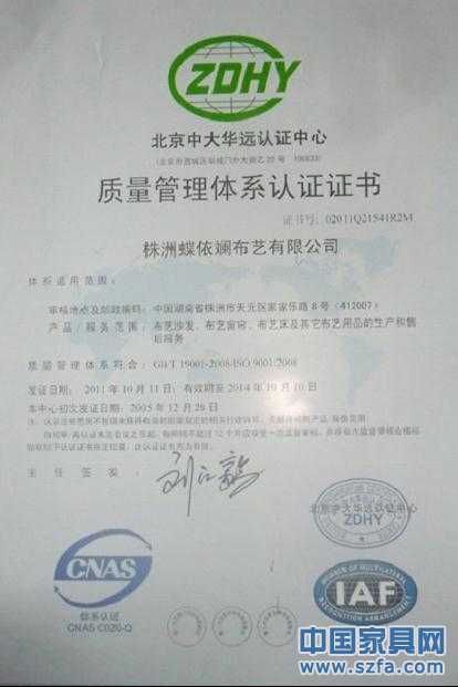 今年十月,蝶依斕家居經(jīng)過ISO質量管理體系認證專家的全面檢查考核,蝶依斕家居再一次通過了ISO9001質量管理體系認證,這也再次證明了蝶依斕人一直兌現(xiàn)了對社會的承諾:科學管理,嚴格檢測,追求卓越,永不滿足,將產(chǎn)品質量始終放在第一位,蝶依斕再一次通過ISO質量管理體系認證,也充分證明了蝶依斕家居其高品質的產(chǎn)品得到了官方的再次認可。