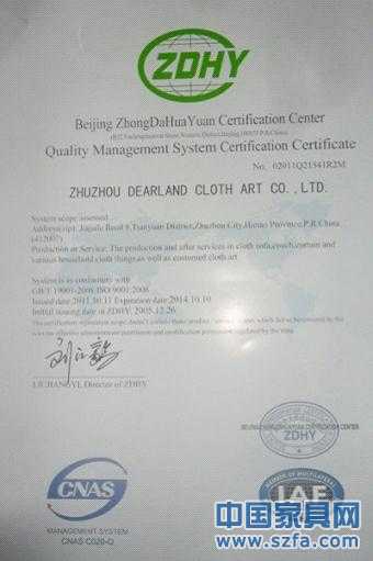 通過ISO9001質量管理體系認證是蝶依斕家居永恒的主題,質量是一個品牌發(fā)展壯大的關鍵,在逐步完善質量體系的進程中,經(jīng)過長時間的準備,2000年伊始,蝶依斕家居就申請了——ISO9000國際質量體系認證,此次認證邀請的是國內最權威的北就中大華遠認證中心作為蝶依斕質量體系的審核單位,認證的范圍包括蝶依斕家居布藝沙發(fā),布藝窗簾,布藝床及其它布藝有品的生產(chǎn)和售后服務。在本次考核過程中,認證中心專家對蝶依斕家居產(chǎn)品的研發(fā)、生產(chǎn)、檢驗等每個環(huán)節(jié)進行了認真、仔細的檢查,對產(chǎn)品標準、生產(chǎn)流程、工藝文件、原材物料管理制度等進行了嚴格的檢查考核,此外,專家們還對蝶依斕公司質量管理制度貫徹執(zhí)行情況進行了檢查考核,所有檢驗、考核都順利通過。