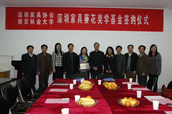 2011年11月18日,深圳市家具行業(yè)協(xié)會、深圳家具研究開發(fā)院、中國家具產(chǎn)業(yè)教育學(xué)院賴珍珍院長出席了在南京林業(yè)大學(xué)家具與工業(yè)設(shè)計學(xué)院舉行的“深圳家具行業(yè)協(xié)會、南京林業(yè)大學(xué)‘深圳家具葵花獎學(xué)基金’簽約儀式”。南京林業(yè)大學(xué)副校長趙林教授、教育發(fā)展基金會理事長陳景歡教授及南林相關(guān)職能部門的單位負(fù)責(zé)人和學(xué)生代表出席了簽約儀式。捐贈儀式由南京林業(yè)大學(xué)家具與工業(yè)設(shè)計學(xué)院院長吳智慧教授主持,賴珍珍女士和吳智慧教授分別代深圳家協(xié)、南京林業(yè)大學(xué)在捐贈協(xié)議上簽字。