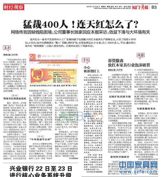 “聽說這段時間內(nèi),連天紅員工常鬧事,因?yàn)楣べY發(fā)不出來,可能快倒閉了!”曾一度爆紅的連天紅(福建)紅木家具公司,眼下突然變得“緋聞纏身”,負(fù)面消息不斷。記者昨日采訪獲悉,受大環(huán)境影響,眼下連天紅確實(shí)面臨效益下滑的困境,廣告投入甚至同比縮水近一半。而業(yè)界指出,連天紅的“危機(jī)”,也暴露出了經(jīng)爆炒后的中國紅木家具市場,眼下已是疲態(tài)漸露。
