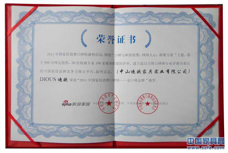 迪歐家具榮獲“2011家具消費(fèi)口碑榜金口碑”
