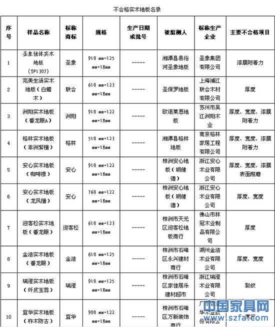 在不合格名單中發(fā)現(xiàn),標(biāo)稱圣象集團(tuán)有限公司生產(chǎn)的910 mm*125 mm*18mm圣象獨體實木地板(SP1307)漆膜附著力項目不合格,標(biāo)稱廣東省宜華木業(yè)股份有限公司生產(chǎn)的900 mm*122 mm*18mm宜華實木地板(柞木防古)寬度項目不合格。