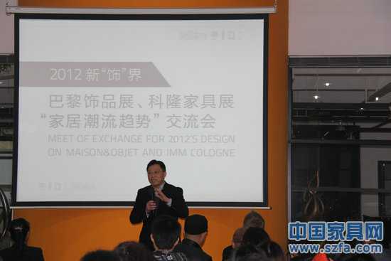 2月10日下午14:30~17:30,由深圳市家具行業(yè)協(xié)會(huì)主辦的2012年巴黎春季時(shí)尚家居飾品展及2012年德國(guó)科隆國(guó)際家具展交流分享會(huì)隆重召開(kāi),會(huì)議流程包括巴黎展和科隆展簡(jiǎn)介、精彩展品圖片分享、家居飾品及陳設(shè)潮流走勢(shì)預(yù)測(cè)、紅酒品鑒等環(huán)節(jié),主講為《深圳家飾》主編嚴(yán)偉群女士。