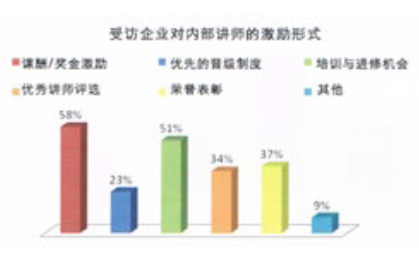 “課酬/獎(jiǎng)金激勵(lì)、培訓(xùn)與進(jìn)修機(jī)會(huì)、榮譽(yù)表彰”成為企業(yè)內(nèi)部對講師的主要激勵(lì)方式,“優(yōu)先的晉級制度”只占23%,內(nèi)部講師的激勵(lì)機(jī)制還有待進(jìn)一步的完善。